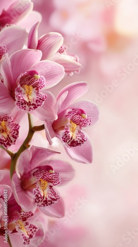 Stunning photo of delicate pink soft background featuring orchid flowers Floral greeting card spring concept with Copy space.