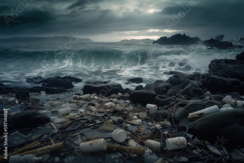 ocean, pollution, impact, urgency, protect, natural, environment, lighting, beach, nature, coast, wave, seascape, blue, coastline, wave, contrast, gloom, reality, harsh, color palette, beauty, environmentalism, conservation, water, marine life, ecosystem, sea, garbage, trash, debris, litter, planet, earth, climate change, sustainability, disposal, waste management, recycling, generative, ai