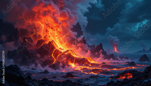 eruption, lava, volcano, landscape, nature, ocean, night, dramatic, fiery, rock, smoke, cloud, heat, magma, scenery, geothermal, molten, illumination, wilderness, power, beauty, earth, environment, natural