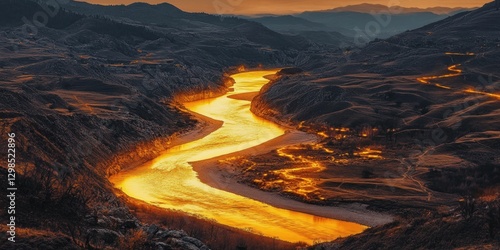 sunset, river, gold, landscape, mountain, nature, winding, peaceful, dusk, water, colourful, serene, calmness, outdoors, scenic, evening, light, beauty, horizon, scenery, rock, vale, flow, sky, vista, environment, travel, adventure, calm, terrain, panorama, natural, countryside, wildlife, exploration, wood, atmosphere, glow, colours, warmth, peacefulness, river bank, sunlight, twilight, glowing, shimmering