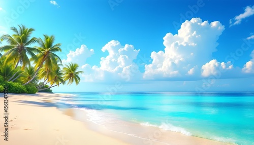Stunning Tropical Beach Scene Azure Waters, White Sand, and Lush Palm Trees
