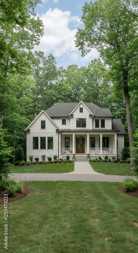 house, home, farmhouse, white, modern, architecture, exterior, landscape, residential, property, building, estate, luxury, design, real estate, porch, lawn, yard, tree, window, roof, grey, driveway, paseo, shrub, flower, plant, light, sky, cloud, summer, style, traditional, column, door, wood, upscale, suburban