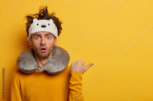 Stupefied male passenger travels in car or plane, shows something on copy space area with shocked expression, has comfortable journey, wears travel neck pillow, isolated on yellow background