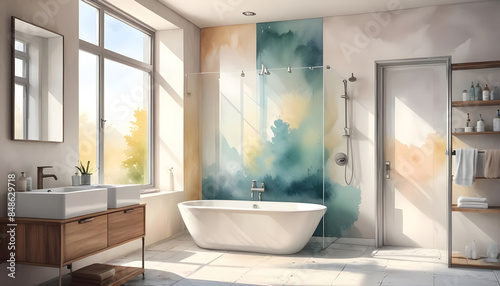 apartment, architecture, illustration, interior, light, luxury, mirror, modern, room, home, shower, style, stylish, towel, wall, window, wooden, house, glasses, elegant, cosy, beautiful, decor, design, clean, contemporary, bathroom, bathe, floor, water, white, template, background, ceramic, sink, furniture, bathtub, render, hygiene, indoor, faucet, empty, designer, decoration, new, ornament
