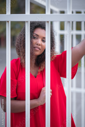 woman, style, pursed, bar, street, appearance, feminine, fashion, construction, city, outfit, wear, garment, red, urban, summer, lady, black, african american, female, town, purse, curly hair, apparel, attractive, black hair, brunette, charming, light, attire, gorgeous, charme, structure, trendy, metal, district, dark hair, confident, bag, thoughtful, pensive, serious, young