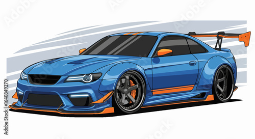 car, vehicle, automobile, sports car, blue, orange, graphic, illustration, design, modified, custom, automotive, art, digital, exterior, body, rim, wheel, design element, modern, sporty, fast, speed, line art, vector, isolated, copy space, digital artwork, transportation, racecar