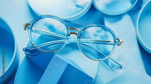 eyeglass, blue, goggles, fashion, trendy, style, accessory, modern, design, background, abstract, shape, circle, geometric, display, product, presentation, promotional, still life, studio, photo, light, clear, transparent, round, gold, accessory, colourful, retail, optical, elegant, optical, image, luxury, eyewear, detail, closeup, promotion, advertising, store, collection, sale