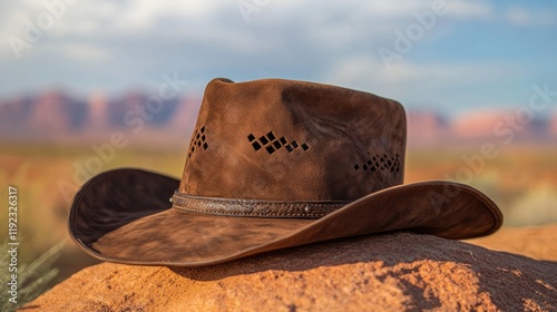 Stylish cowboy hat in suede brown, set on a warm desert-inspired background.
