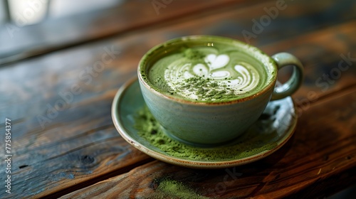 Stylish Cup of Green Matcha Latte with Artistic Latte Art on a Rustic Wooden Table