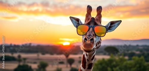 Stylish giraffe in colorful glasses greets sunrise, vibrant dawn colors, sunrise colors, colorful
