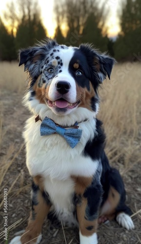 Stylish Humanoid Gentleman Dog in a Formal Well-Made Bow Tie at a Business Dance Party Ball Celebration - Realistic Portrait Illustration Art Showcasing Cute and Cool Australian Shepherd generative AI
