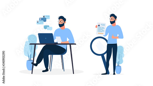 Stylish man in glasses works at a laptop. The guy holds a resume in his hands and shows the class. The concept of finding people for work. Isolated on a white background. Vector.