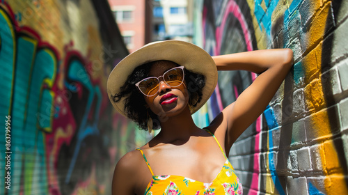 Stylish model strikes a pose in graffiti-filled alley, clutching trendy sunhat and sporting chic eyewear.