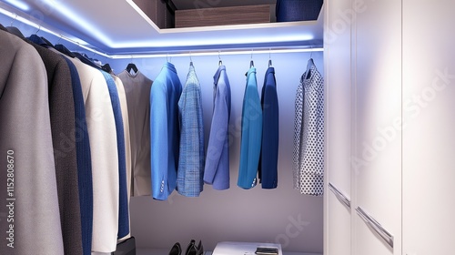 closet, clothing, blue, white, fashion, modern, organisation, design, clothes rack, interior, storage, hanger, suit, formal, stylish, neat, minimalistic, chic, decor, elegance, apparel, accessory, shelve, shoe, lifestyle, home, light, illumination, space, compact, furniture, textile, line, neatness, tidy, clean, contemporary, arrangement, tailored, casual attire, fabric, hanger, outfit, dressing, personal