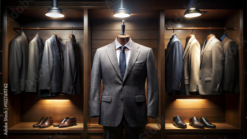 Stylish suits and shoes displayed in an elegant wardrobe setting.