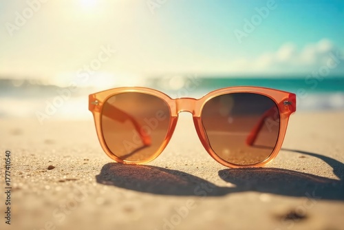 Stylish sunglasses on a beach, reflecting the summer sun Perfect for travel, summer, fashion, and vacation themes Ideal for websites, blogs, and social media , protection, sunshine, ocean
