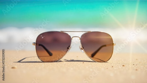 Stylish sunglasses resting on a sun-drenched beach, embodying summer vibes and relaxation Perfect for travel, vacation, and summer fashion promotional materials , hot, ocean, yellow