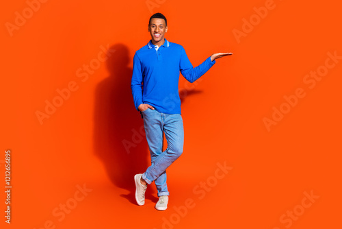 young, man, photogenic, male, guy, student, black, hair, orange, background, multinational, happy, funny, stylish, blue, shirt, polo, casual attire, style, fashion, model, leisure, trend, advertising, shopping, promoting, confident, posing, signs, symbol, expression, hand, smiling, attire, cool, chic, bright, vibrant, unexpected, hand, showing, copy space, sale, offer, discount, product, object, measure, size