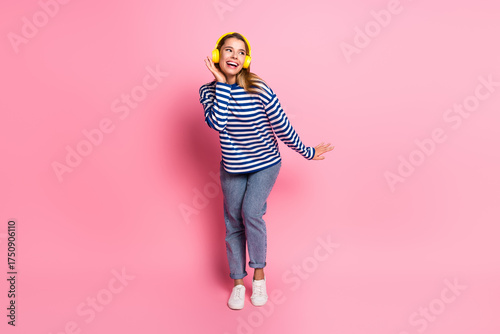 Stylish young woman enjoying music while wearing a striped sweater and headphones, posing against a vibrant pink background
