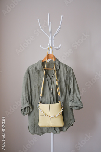 Stylishly Designed Olive Green Shirt Accompanied by Bright Yellow Crossbody Bag Displayed