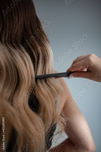 stylist hairdresser makes a hairstyle for a girl in his beauty salon, hollywood wave, beautiful hairstyle, hairdresser at work