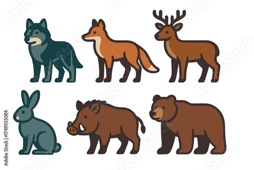 Stylized forest animals collection featuring wolf, fox, deer, rabbit, wild boar, and bear