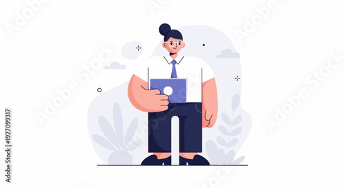 person, woman, girl, female, professional, business, laptop, computer, technology, digital, work, office, corporate, employee, student, study, education, learning, cognition, datum, information, communication, connection, network, cyberspace, online, modern, graphic, illustration, design, vector, character, clean, simple, flat, abstract, background, white, blue, purple, grey, plant, nature, casual attire, confident, smart, creative, friendly, approachable