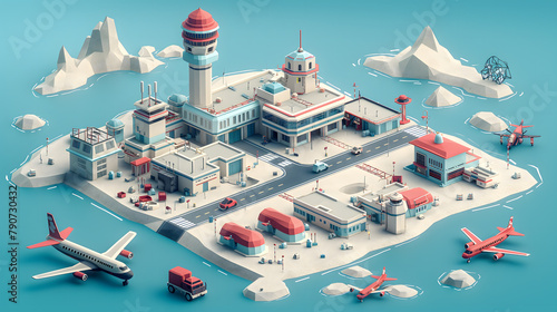 isometric, aerodrome, island, illustration, runway, aircraft, terminal, control, tower, airstrip, travel, sea, architecture, stylised, miniature, transportation, aeroplane, hangar, tour tourism, low, helicopter, geometric, landscape, infrastructure, design, airstream, vector, art, cargo, flight, air, traffic, navigation, graphic, creative, airfield, apron, jet, taxiway, aviation, baggage, boarding, propeller, fence, tarmac, departure, arrival, bus