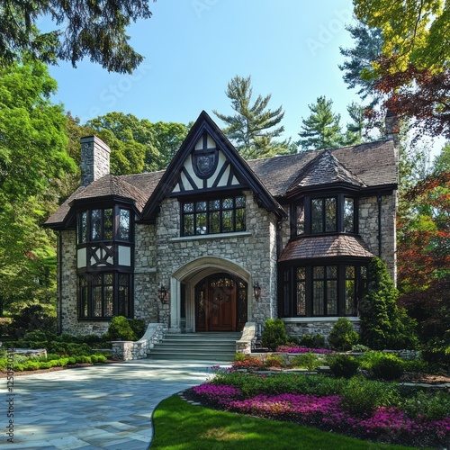 house, home, stone, suburban, luxury, luxury home, property, exterior, driveway, garden, landscape, architecture, building, residential, estate, bungalow, tree, green, yard, summer, day, sunlight, nature, wood, roof, window, door, brick, path, flower, plant, design, style, elegant, beautiful, modern, classic, roomy, comfortable, family, dream, homeowner, lifestyle, wealth, success, investment