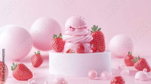 glossy, white, dais, strawberry, ice cream, summer, element, pastel, pink, background, detail, sweet, dessert, display, showcase, fun, delicious, playful, appealing