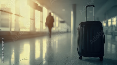 Suitcase in Airport Terminal Waiting Area with Passenger Walking in the Distance