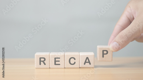 Summary of the economy. Business. Financial concept. Business Plan 2023 word RECAP on wooden cubes and copy space.