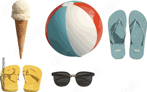 vector, summer, beach, essential, ice cream cone, scoop, treat, refreshment, beach ball, colourful, play, flip-flop, footwear, casual attire, relaxation, sunglasses, sun protection, vacation, structured, monochrome, black-and-white, contrast, clean, graphic, icon, representation, illustration