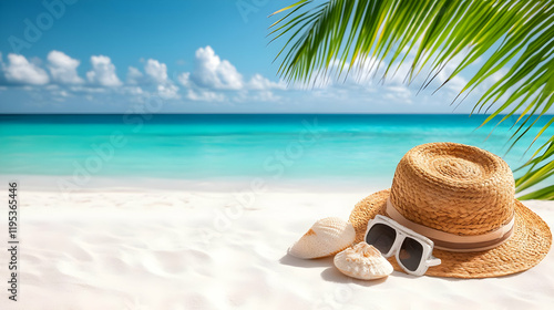 beach, summer, vacation, hat, sunglasses, shell, ocean, sand, palm tree, tropical, turquoise water, white sand, summer getaway, travel, relaxation, paradise, get-away, sunny, coastal, calm sea, tranquil, serene, idylli, escape, carefree, blue skies, cloud, seacoast, coastline, waterfront, sandbeach, beautiful, stunning, amazing, vibrant, breathtaking, picturesque, tranquil scene