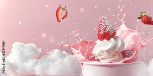 Summer drinks frozen drinks creative food templates. Soft serve strawberry ice cream splashing in the tub, splashing spoon falling on pastel pink background with clouds. Magazines, banners, ads. Copy
