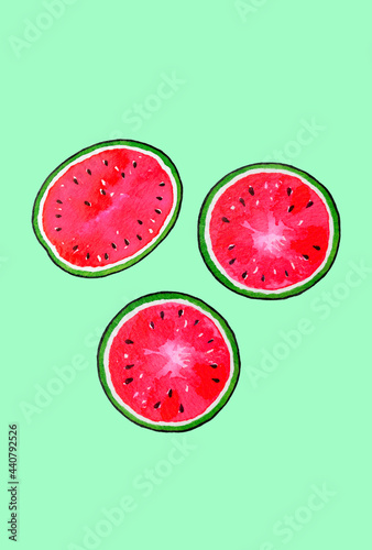illustration, ink, watercolor, watermelon, summer, copy space, light green, three, red, green, design, graphic, greeting, season, food, sweet, delicious, june, july, august