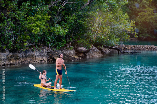 Summer holidays vacation travel. SUP Stand up paddle board. Young woman and man sailing together on beautiful calm lagoon.
