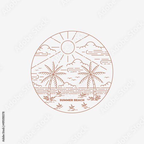 Summer on tropical beach with line art style design vector illustration, badge of tropical island monoline style design inspiration