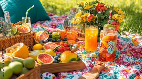 picnic, summer, vibrant, fruit, drink, social, hydratation, variety, colourful, gathering, friends, family, relaxation, leisure, food, refreshment, tasty, healthy, lifestyle, entertainment, blanket, sharing, fresh, basket, delicious