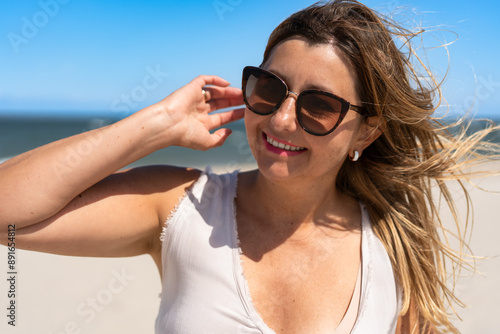 Summer. Portrait of young beautiful smiling woman with long blonde hair in light top and sunglasses against background of sandy beach and sea on sunny day. Energy, joy of life and youth