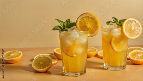 Summer refreshing lemonade drink or alcoholic cocktail with ice and lemon slices. Fresh healthy cold lemon beverage. Water with lemon.