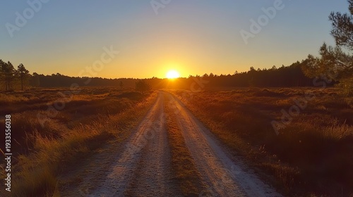 Sun rising over empty dirt road in fischbeker heide nature reserve, peaceful morning landscape