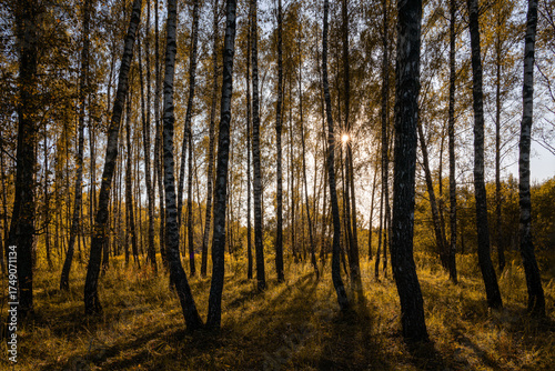 Sun setting through birch tree forest. Golden light illuminating autumn landscape in grove. Natural scenic view for wallpaper design. Sunset in grove.