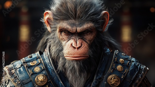 armoring, fantasy, sword, primate, martial art, hero, fierce, strength, legend, combat, epic, weapon, heroic, powerful, cinematic, dark background, mystical