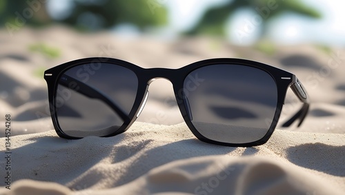 Sunglasses lying on the warm sand, surrounded by a beach setting