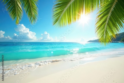 Sun-kissed white sand, gentle waves, palm frond silhouette , palm, summer, peaceful