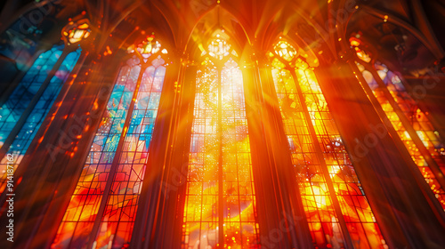 Sunlight beams through a vibrant stained glass window in a historic cathedral, creating a stunning display of colors against the stone interior