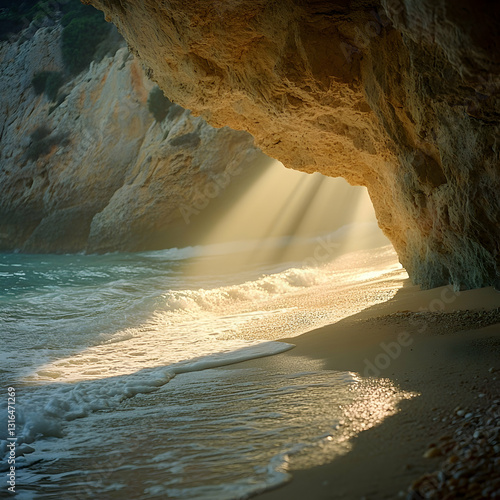 Sunlight piercing through a cliffside cave onto a serene beach landscape