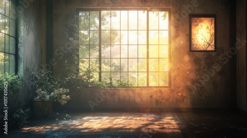 window, room, sunlight, light, ray, interior, rustic, old, vintage, abandoned, natural, wood, floor, plant, green, leaf, wall, stone, frame, picture, art, shadow, dust, gold, warm, bright, soft, dark, beam, glow, haze, morning, day, airy, deserted, glimmer, glasses, house, structure, pane, design, architectural, empty, photo, image