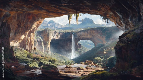 cave, waterfall, landscape, nature, rock, mountain, vale, sunlight, scenic, view, arch, water, stone, cliff, outdoors, environment, scenery, vista, geology, geography, travel, adventure, exploration, wild, wilderness, terrain, formation, green, brown, light, shadow, digital artwork, illustration, fantasy, game, background, image, picture, photo, artwork, art